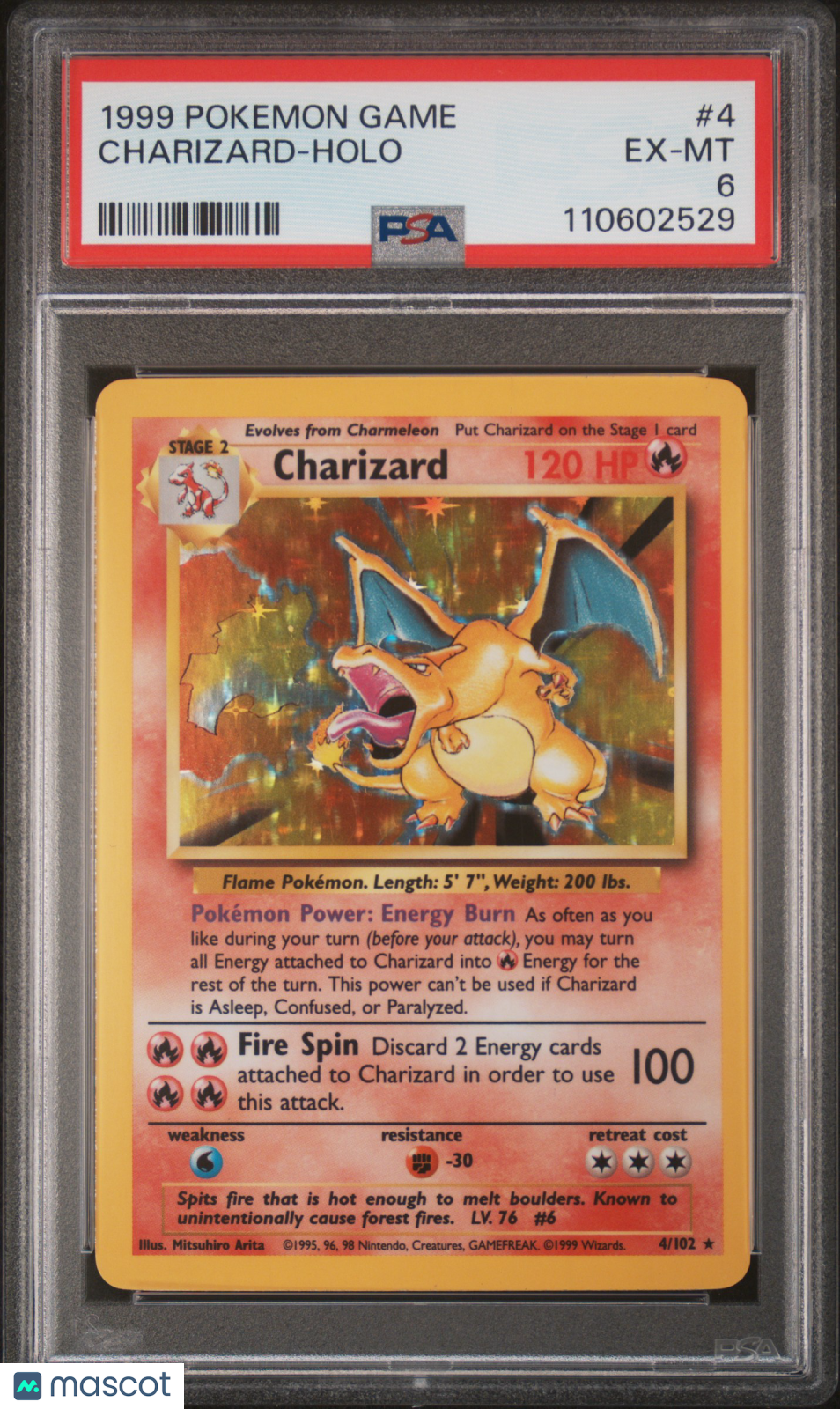 Pokemon TCG Charizard #4 PSA 6 VendorPokemon Share WhatsApp Deel X Pin it Messenger Email Last stock! Product form You are purchasing a Pokemon TCG Charizard #4 PSA 6. You will receive the exact item in the photographs. Thank... Read more 1 in stock $400.00 Excl. VAT Quantity Add to cart This item is a recurring or deferred purchase. By continuing, I agree to the cancellation policy and authorize you to charge my payment method at the prices, frequency and dates listed on this page until my order is fulfilled or I cancel, if permitted.